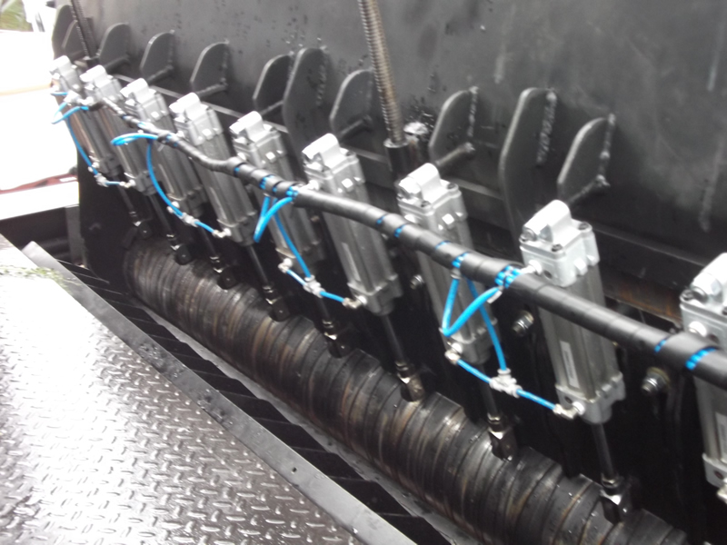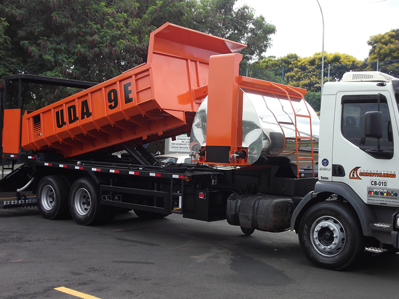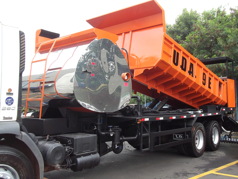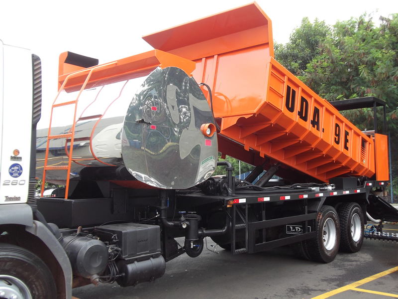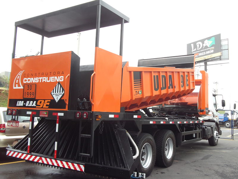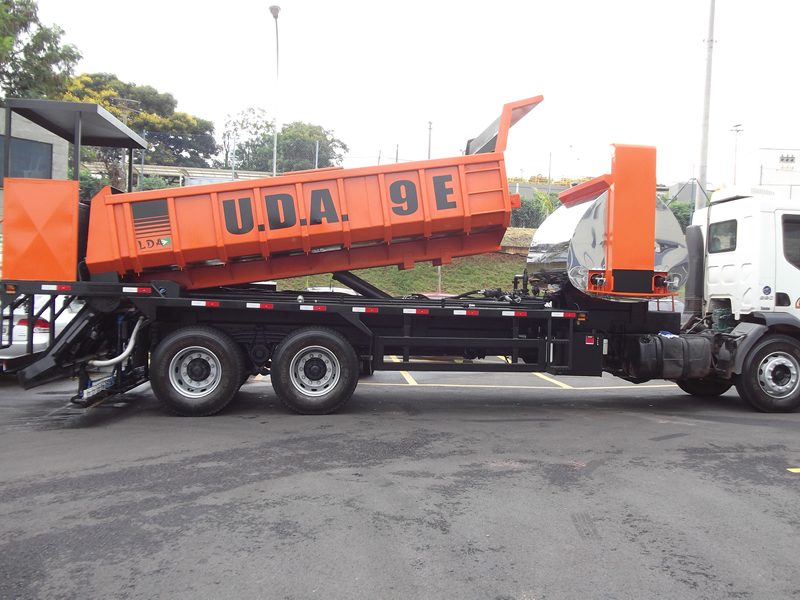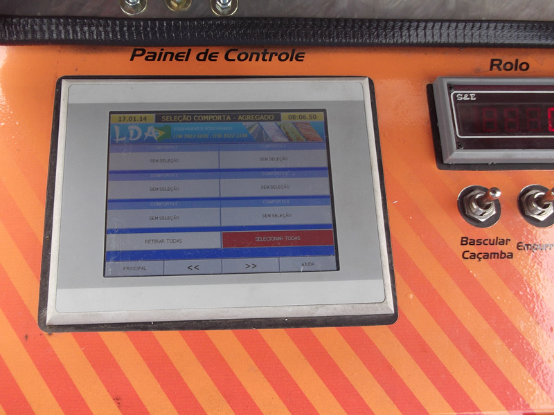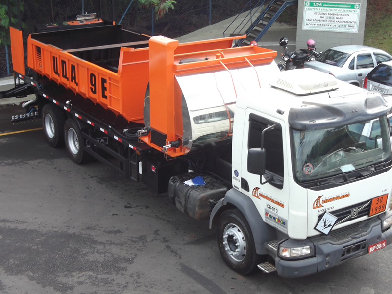 CAÇAMBA12 comportas em aço, com abertura, por cilindros pneumáticos. Empurrador em aço carbono de 3/16" com acionado por cilindro hidráulico telescópio. CONJUNTO HASTE MANUALEquipada com mangueira de 07,0m de comprimento.Bico em alumínio. Acionamento independente por registro de esfera de 1½". TANQUEEstrutura em chapas de aço carbono, espessura de 1/8". Capacidades de armazenamento e 300L de emulsão asfáltica. Isolamento térmico com lã de vidro em espessura 50mm.Revestimento externo com chapas em aço inoxidável 304 (polidas) Boca de inspeção providas de válvulas de segurança e contenção anti transbordo Tanques independentes com capacidade 100 L. BARRA DE DISTRIBUIÇÃOTipo flutuante com de acionamento hidráulico por pistão posicionado na vertical 3 seções sendo: central, fixa, com 2,20 m e Laterais, articuladas, com 0,70 m Largura de 3,60 metros, com 36 registros de fechamento rápido em alumínio 36 bicos de aspersão em latão Sistema integrado de limpeza dos componentes por óleo diesel. MAÇARICOAlta pressão com capacidade de 180.000 Kcal cada, alimentado por óleo diesel e ar comprimido. TERMÔMETROCom escalas de 0° à 250° instalado na parte lateral do tanque. BOMBA DE ASFALTO3” de diâmetro do tipo engrenagem em aço temperado Vazão variável de até 30.000 litros por hora, acionada por motor hidráulico. QUINTA RODAMontada no chassis do caminhão. SISTEMAS ELÉTRICOS E HIDRÁULICOS12 volts alimentado pelo motor estacionário 2 bombas hidráulicas, uma de pistão de vazão variável, e uma de engrenagem. COMANDO HIDRÁULICO E PAINELComandos hidráulicos composto por dois blocos manifolds com válvulas solenóides Em tela IHM de 6” touch-screen. SAIA DISTRIBUIDORAEm chapa de aço carbono 1/8” com 24 canaletas. ROLOEm tubo schedule 80 de 8” frisado. SISTEMA PNEUMÁTICO4 blocos manifolds com 6 válvulas eletropneumáticas em cada Filtro lubrificador com mangueiras de ar 6mm e 8mm e sistema de engate rápido. COMPONENTES DO EQUIPAMENTO .................................................................................................................. |